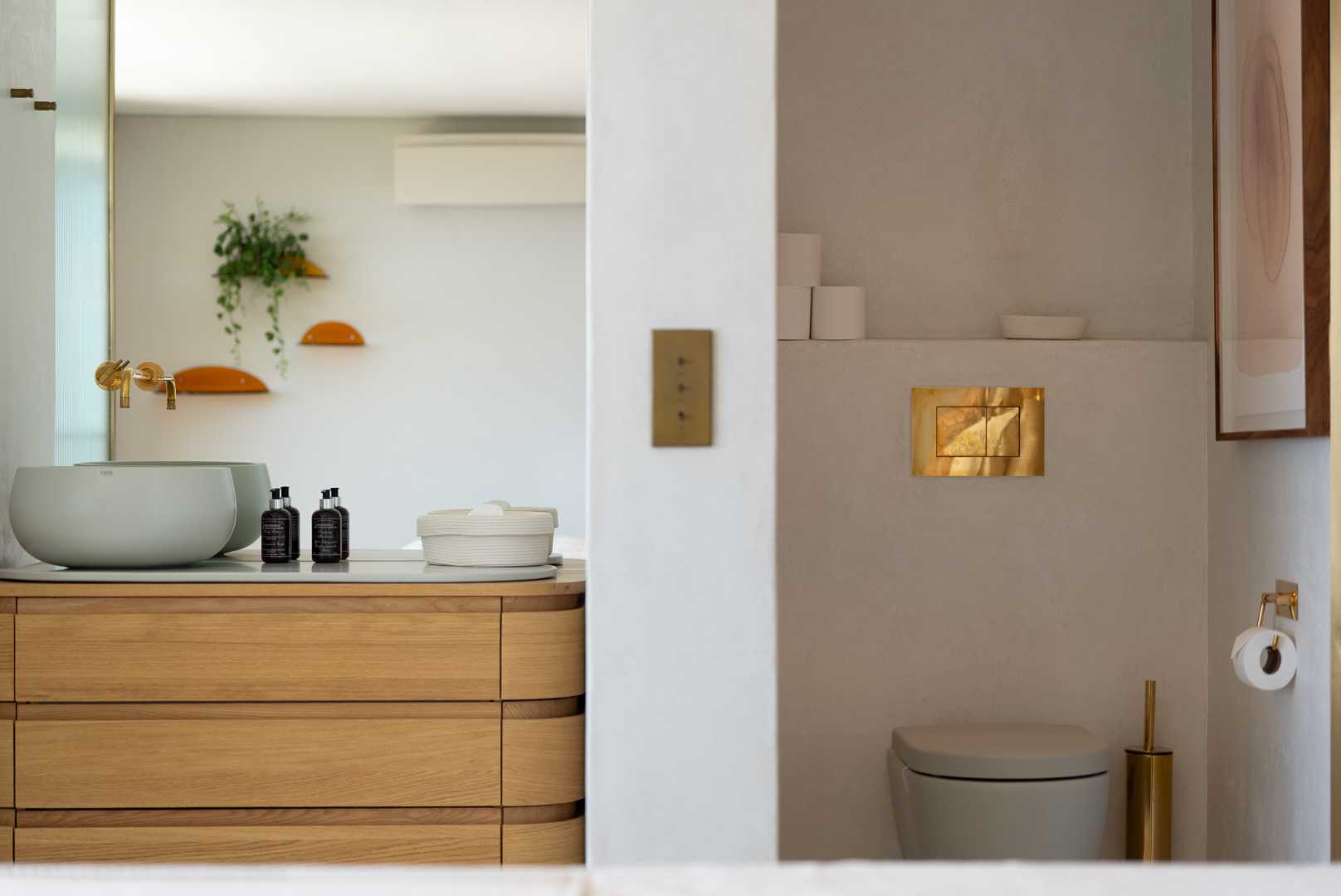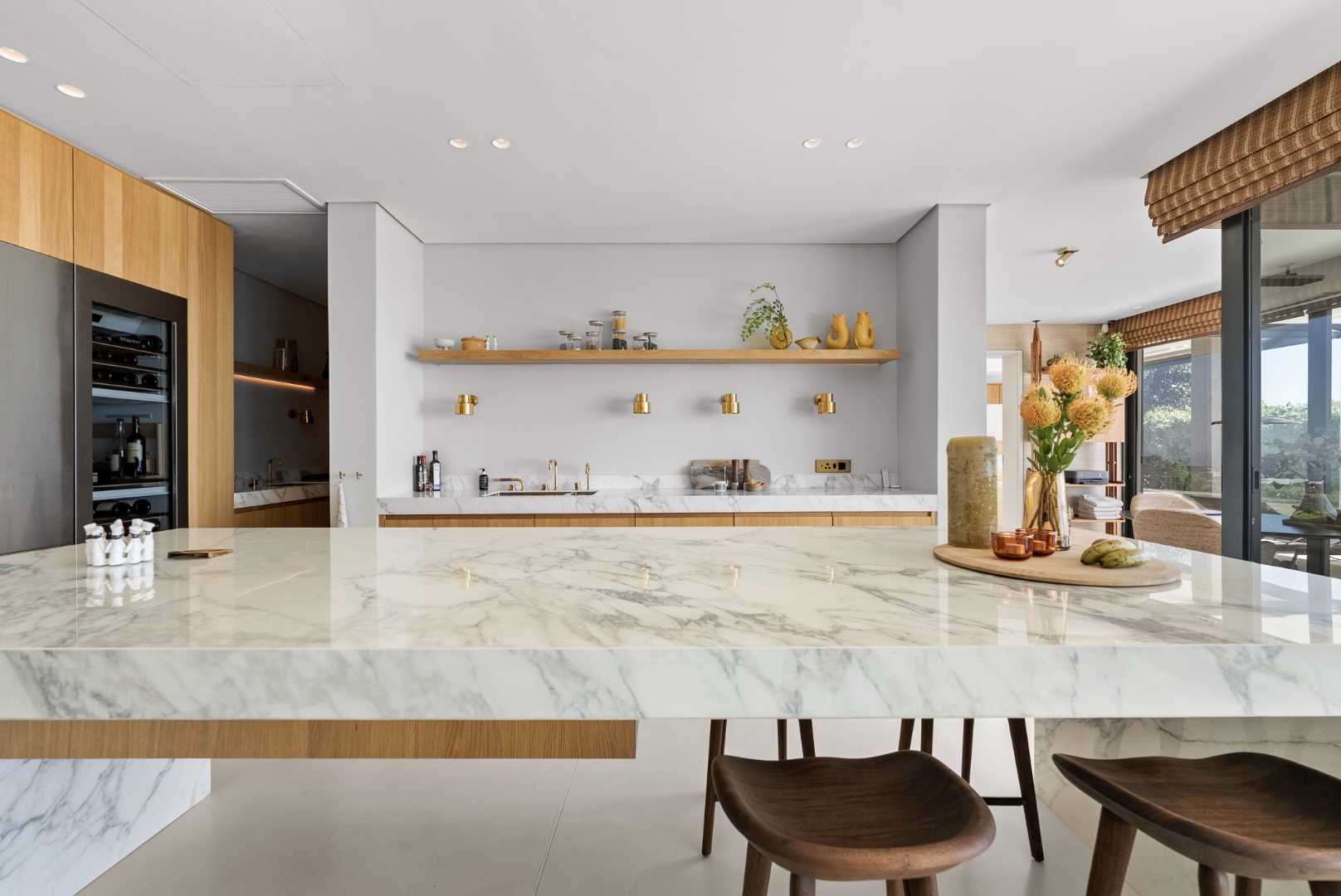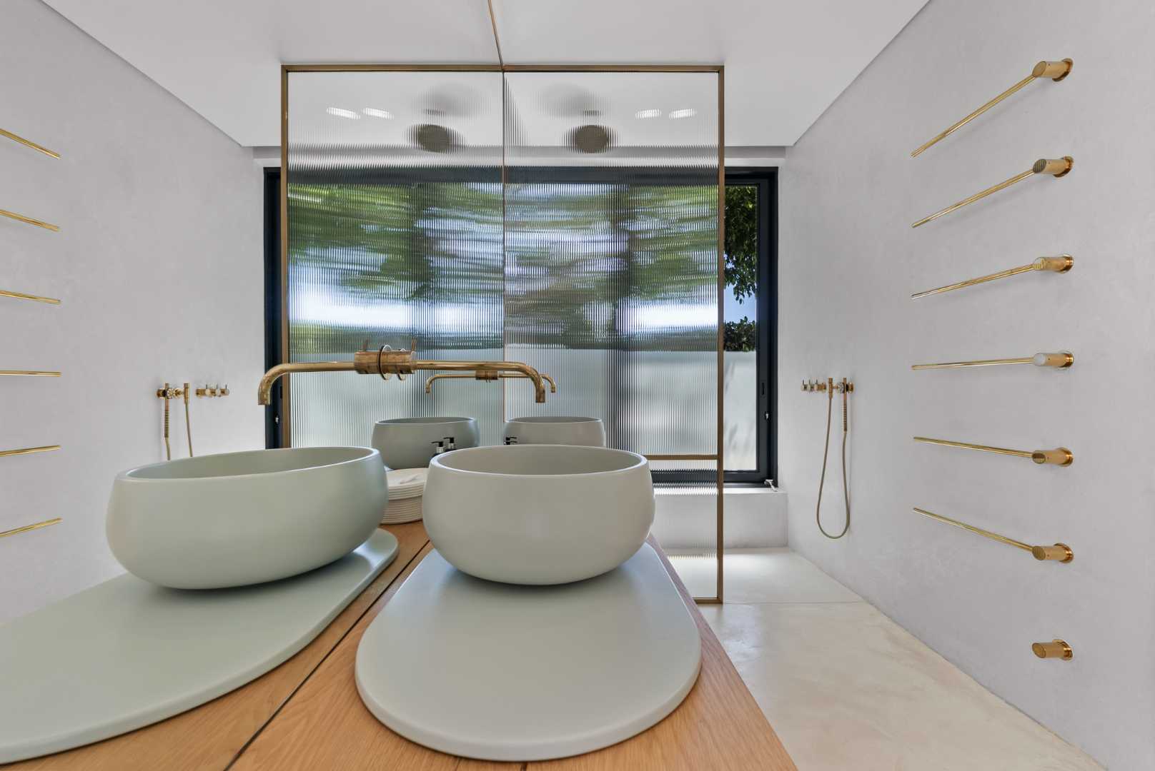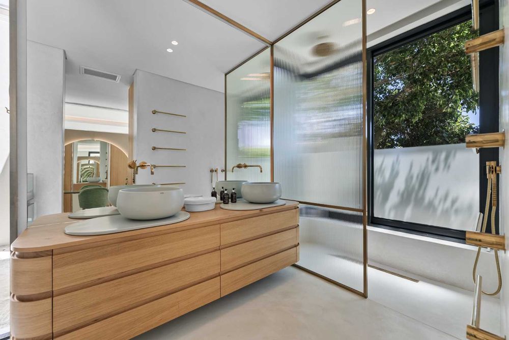 Brass Vola tapware features throughout the residence, paired with bronze shower frames and modern light fittings, reflecting a level of craftsmanship and material quality that is rarely found. Bathrooms include double showers and Ceramica Cielo finishes, all contributing to the home’s architectural integrity.