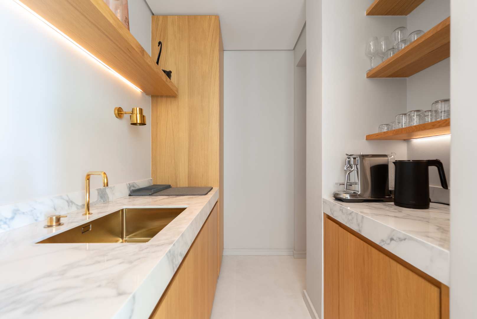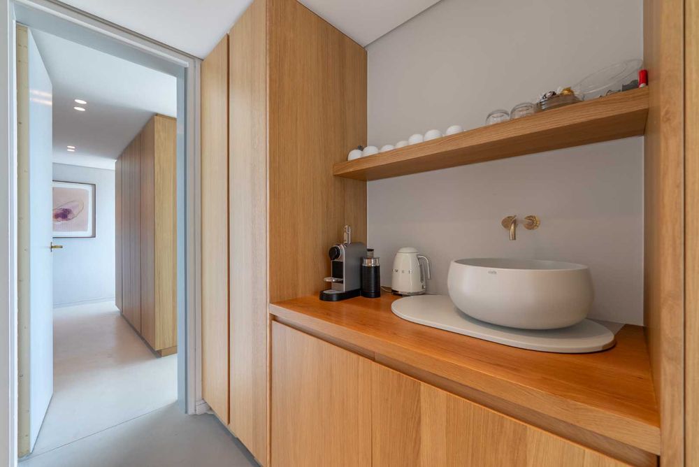At the centre of the home, the open-plan kitchen stands out with a state-of-the-art 4-burner Invisacook hob — a seamless, modern cooking surface that sets the tone for the home’s premium finishes. The kitchen is complemented by Miele appliances, a full-spec oven and an oven-microwave, a main refrigerator and an additional cooler integrated beneath the coffee station. A spacious scullery ensures the main living areas remain uncluttered and perfectly suited to effortless entertaining. Discreet power ports beneath the island add further finesse and practicality.