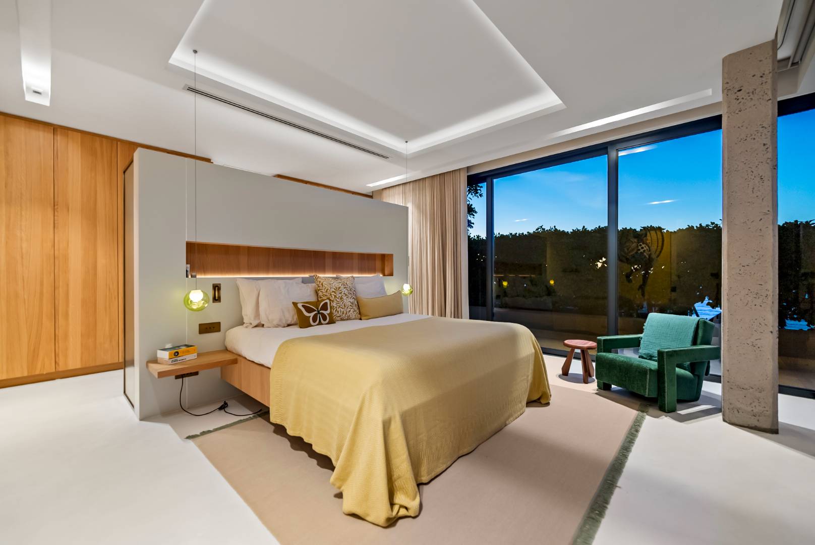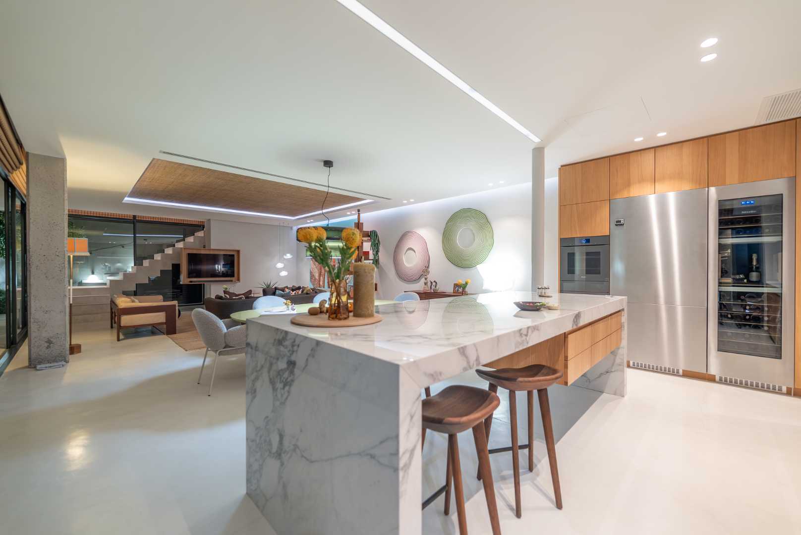 The interior is finished with microcement flooring, contributing to a seamless, modern flow that ties the architectural elements together.