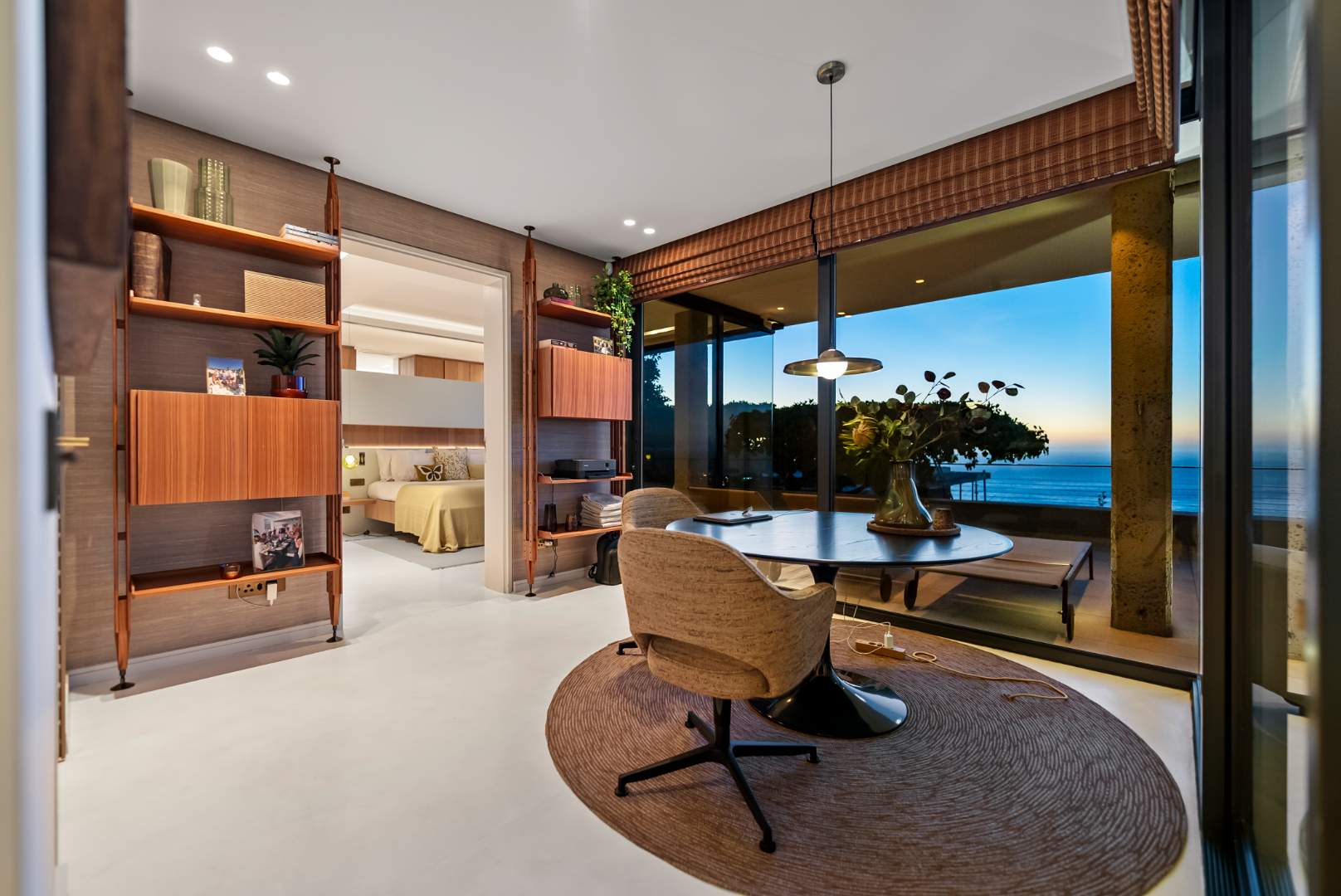 Comfort and control are central to the home’s design: air-conditioning and underfloor heating run across both levels — with Lumin 8 lighting automation, dimmable fittings, electric blinds, and automated sunscreens with full sunblock curtains offering complete flexibility. Dual-standard USB ports (South African and European) are positioned at every bedside.