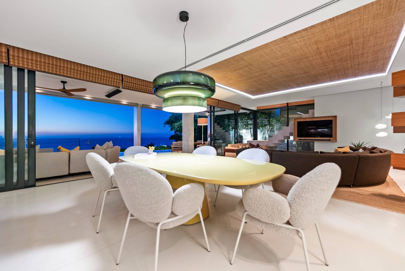 The home captures panoramic ocean and mountain views, framed by double-volume interiors and expansive glazing that draw natural light throughout the day.
