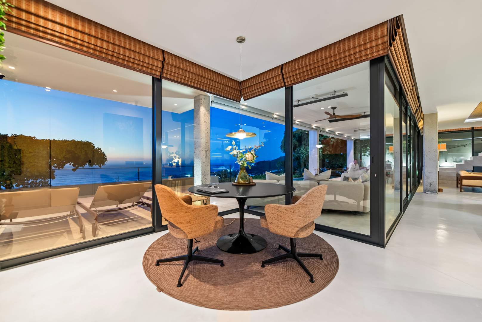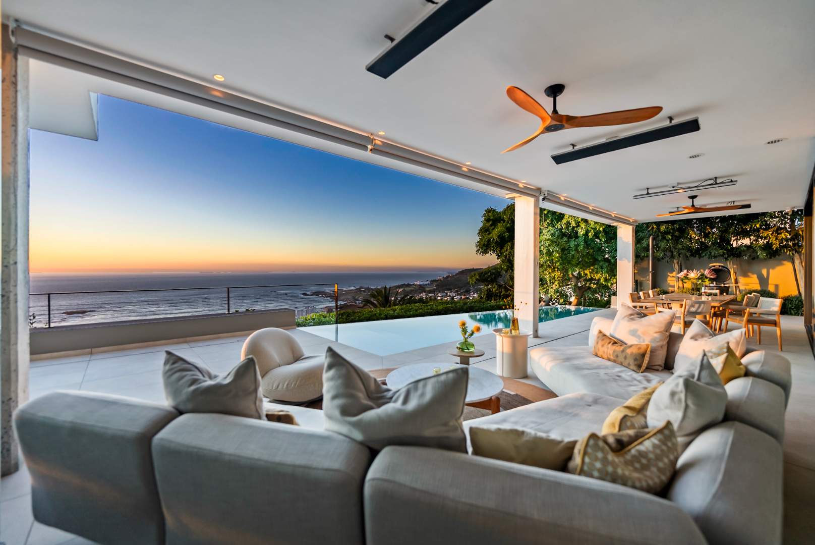 The living and dining areas open through floor-to-ceiling stacker doors onto a sheltered, wind-free terrace — an elegant extension of the home’s entertainment space. Here, a heated rim-flow pool with heat pump and automatic cover creates a serene focal point, designed for year-round enjoyment and complete privacy.