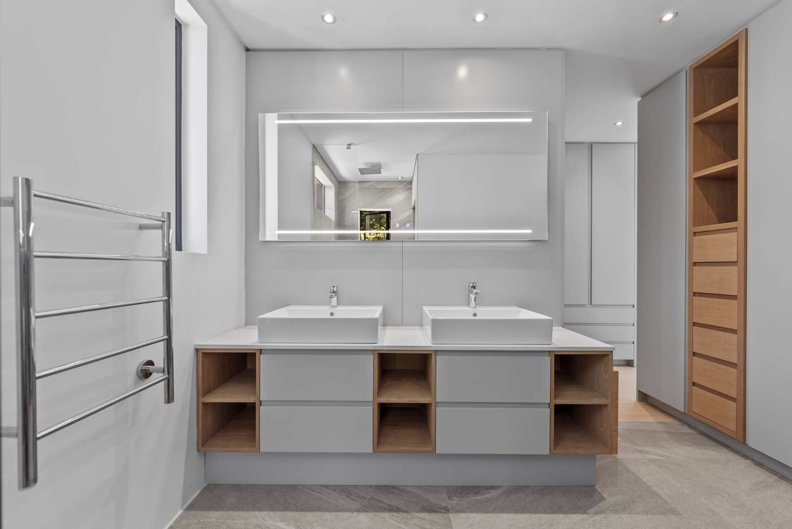 The mix of oak and white finishes adds warmth and character, making the space both luxurious and welcoming.