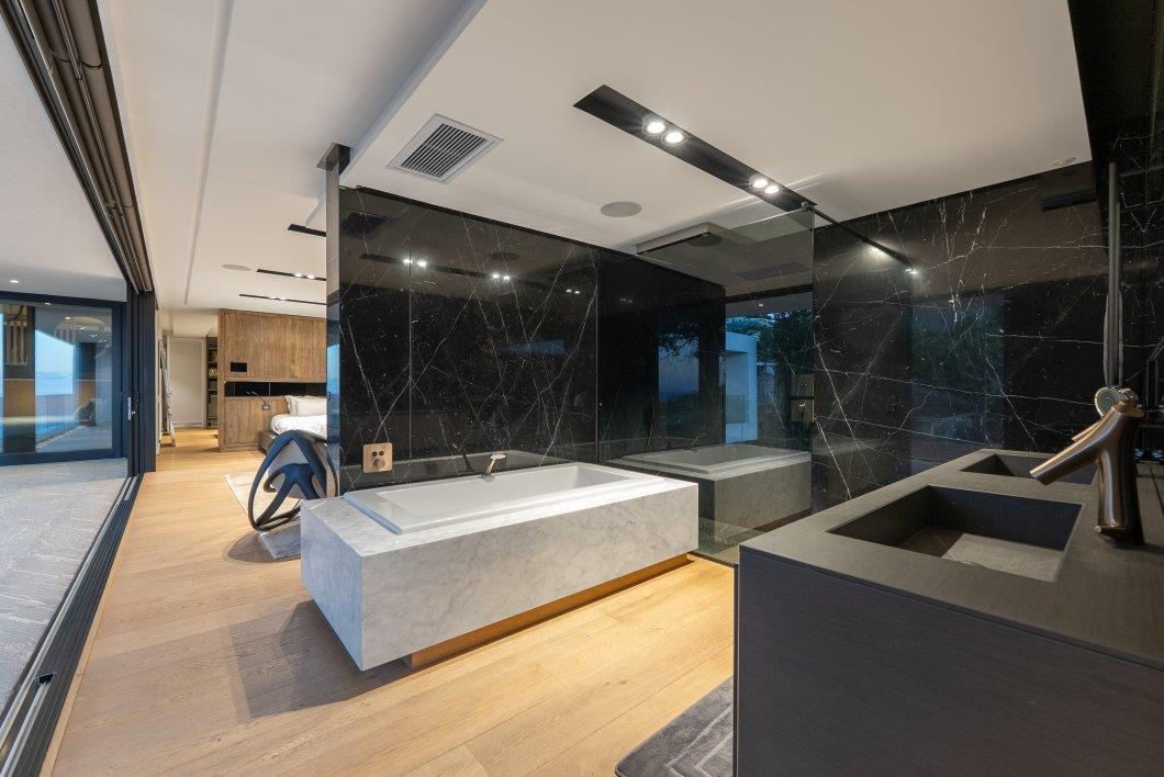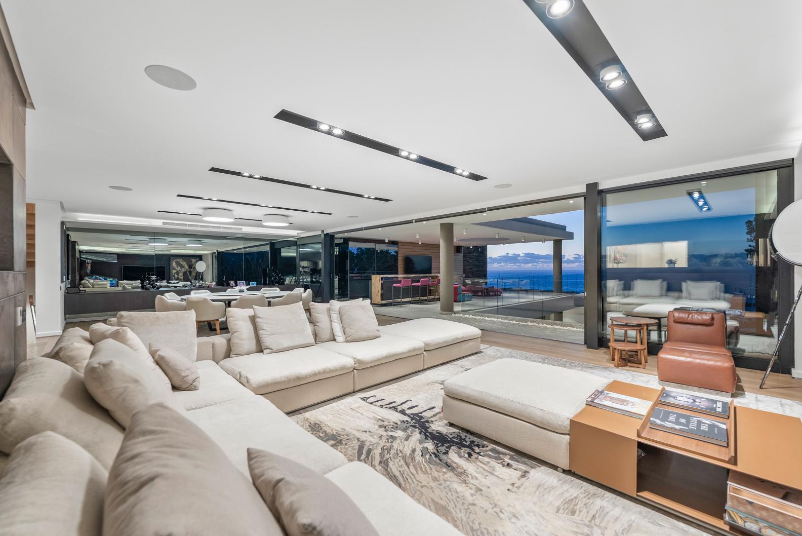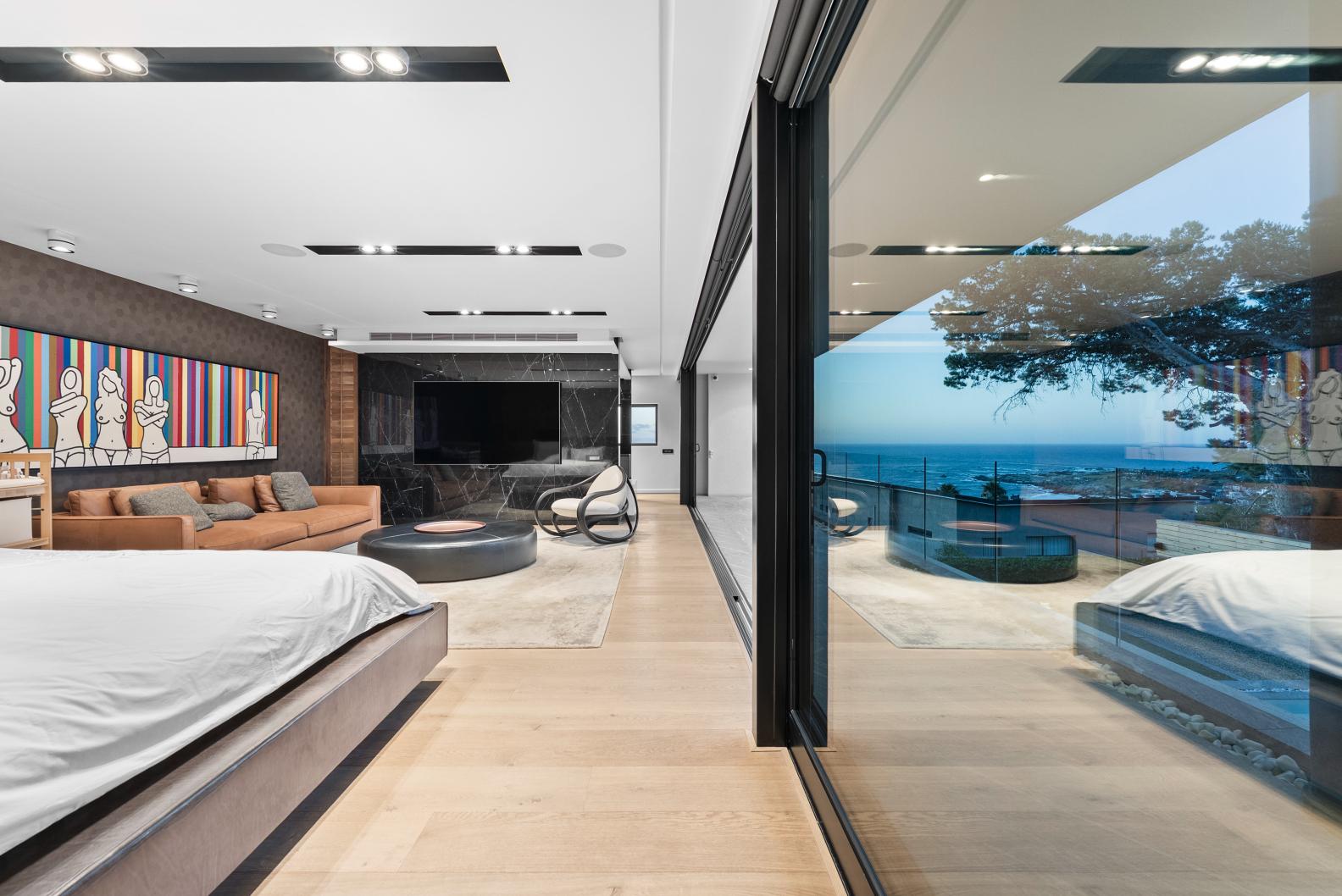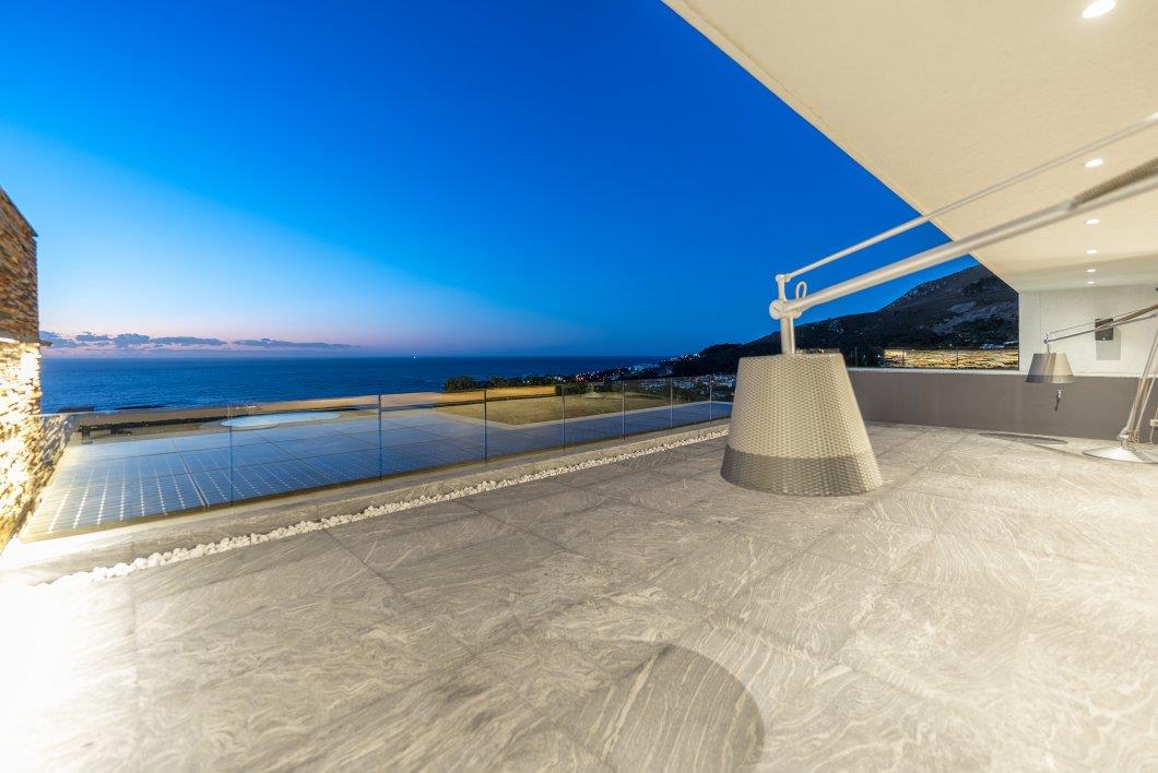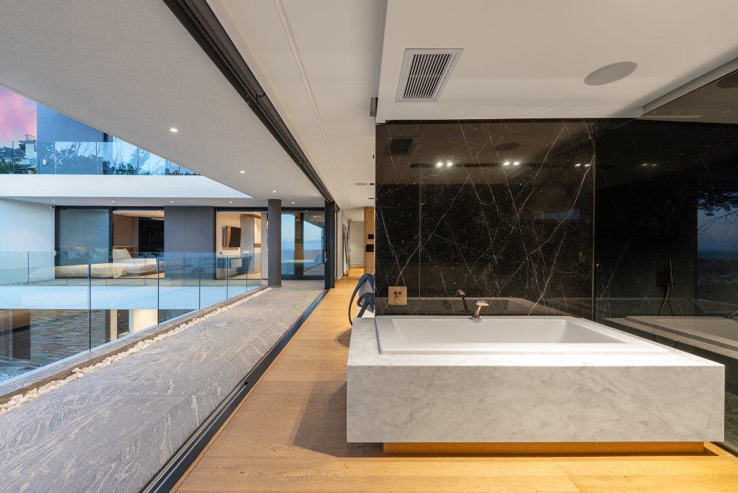 PRICE INCLUDES V.A.T This striking contemporary villa is defined by wrap-around glass walls that frame sweeping sea and mountain views, creating a seamless connection between refined interiors and the surrounding landscape.