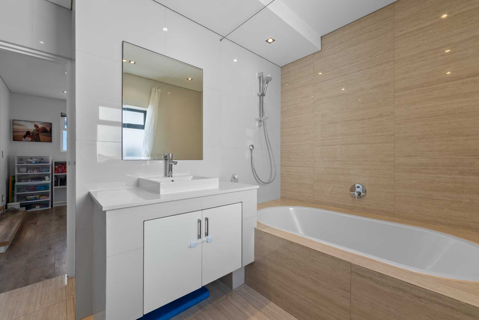 Upstairs, the main bedroom enjoys fantastic views, a full en-suite bathroom, and plenty of built-in cupboards. Two additional bedrooms are located on this level — including one with a wrap-around balcony and another with a Juliet balcony — together with a shared lounge/play area, a bathroom, and a flexible room that currently serves as a gym.