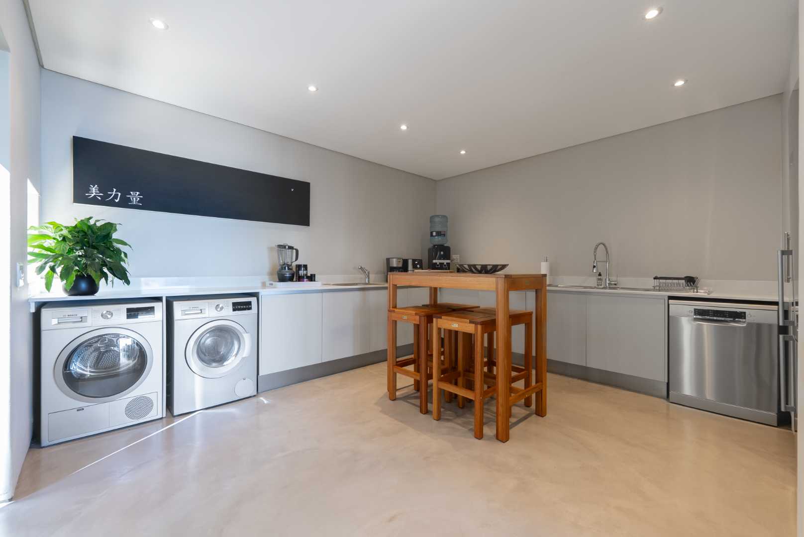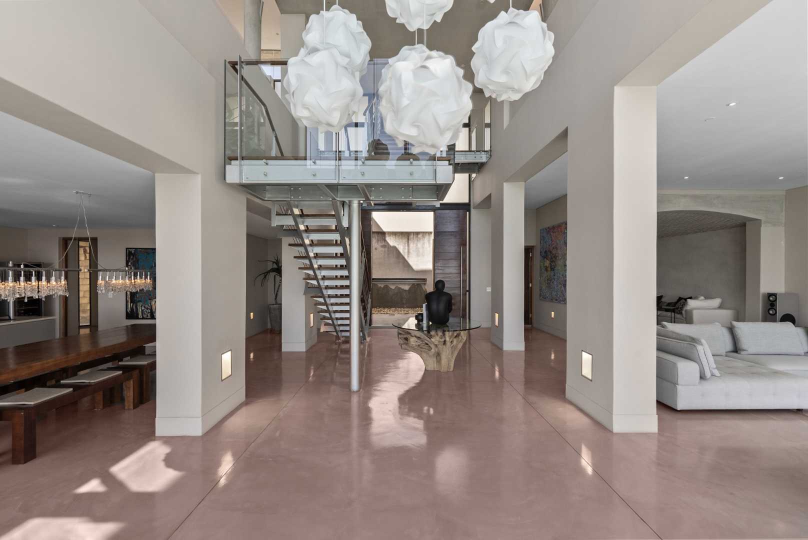 A striking water feature leads to a dramatic triple-volume entrance, setting the tone for the impeccable design within. Expansive open-plan living areas flow effortlessly across brand-new cement screed floors, revealing a gourmet Italian kitchen equipped with dual Bosch wine coolers, a separate scullery, and abundant storage—perfectly curated for both entertaining and everyday living.
