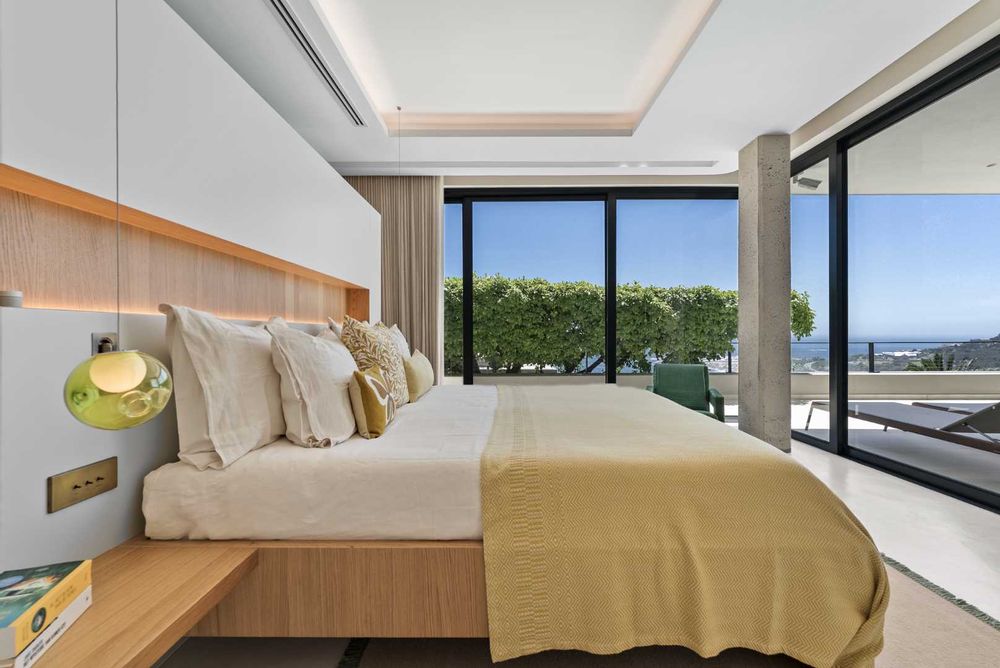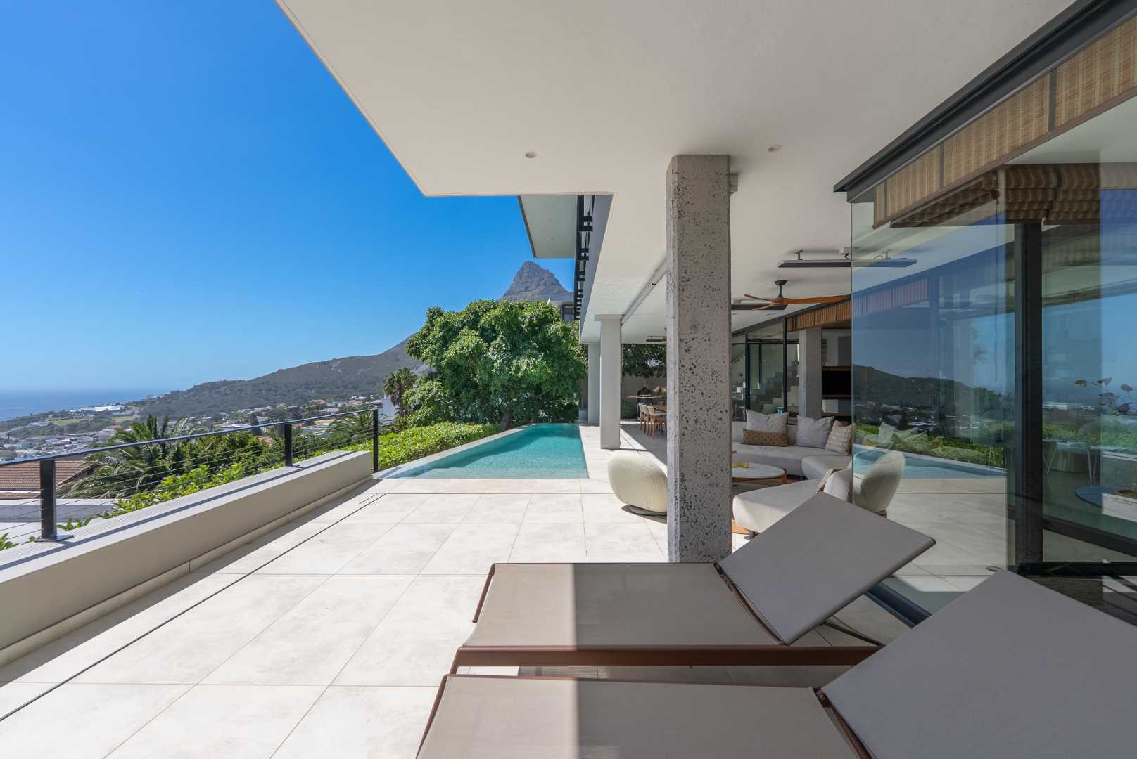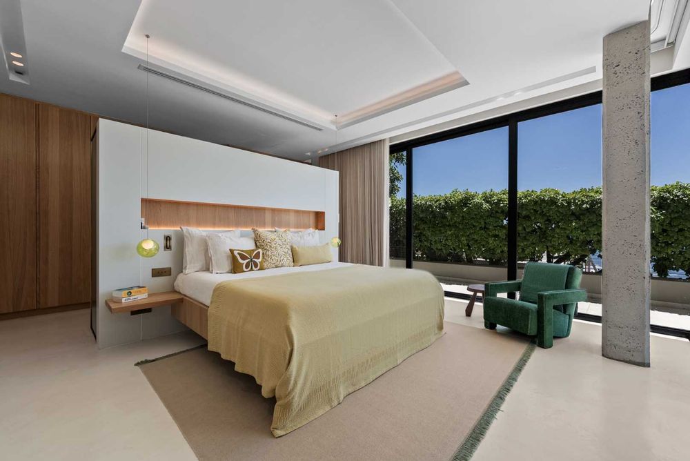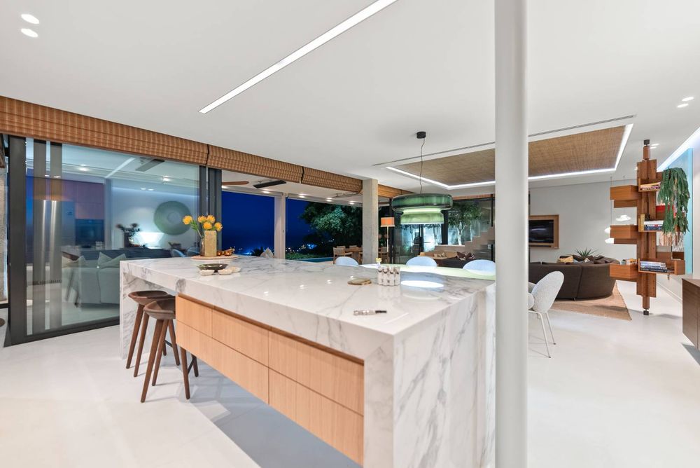 The home captures panoramic ocean and mountain views, framed by double-volume interiors and expansive glazing that draw natural light throughout the day.
