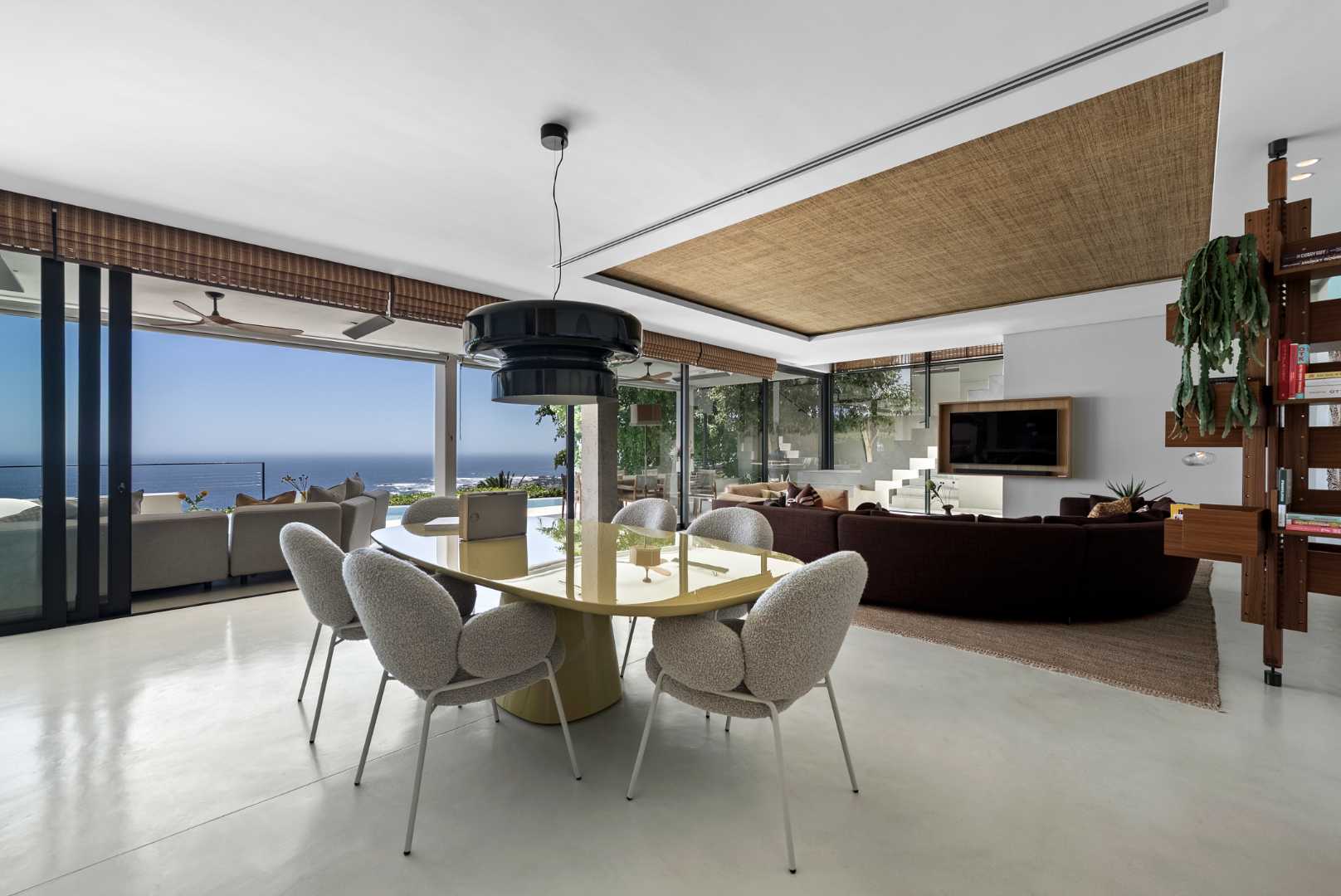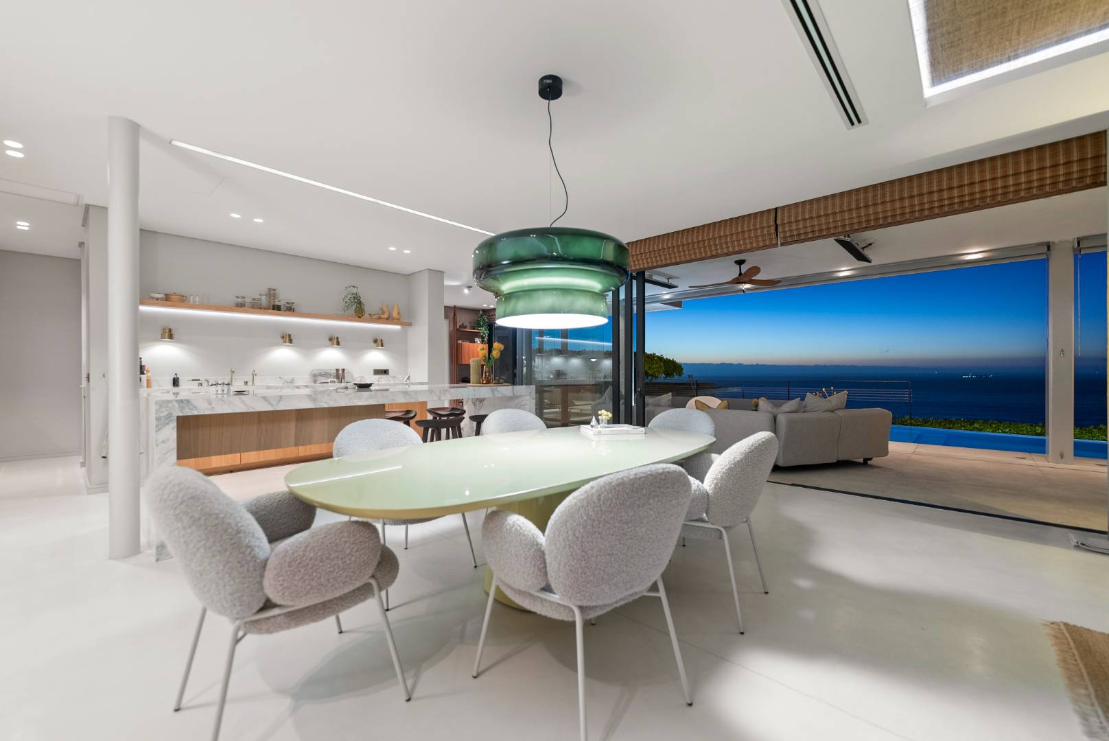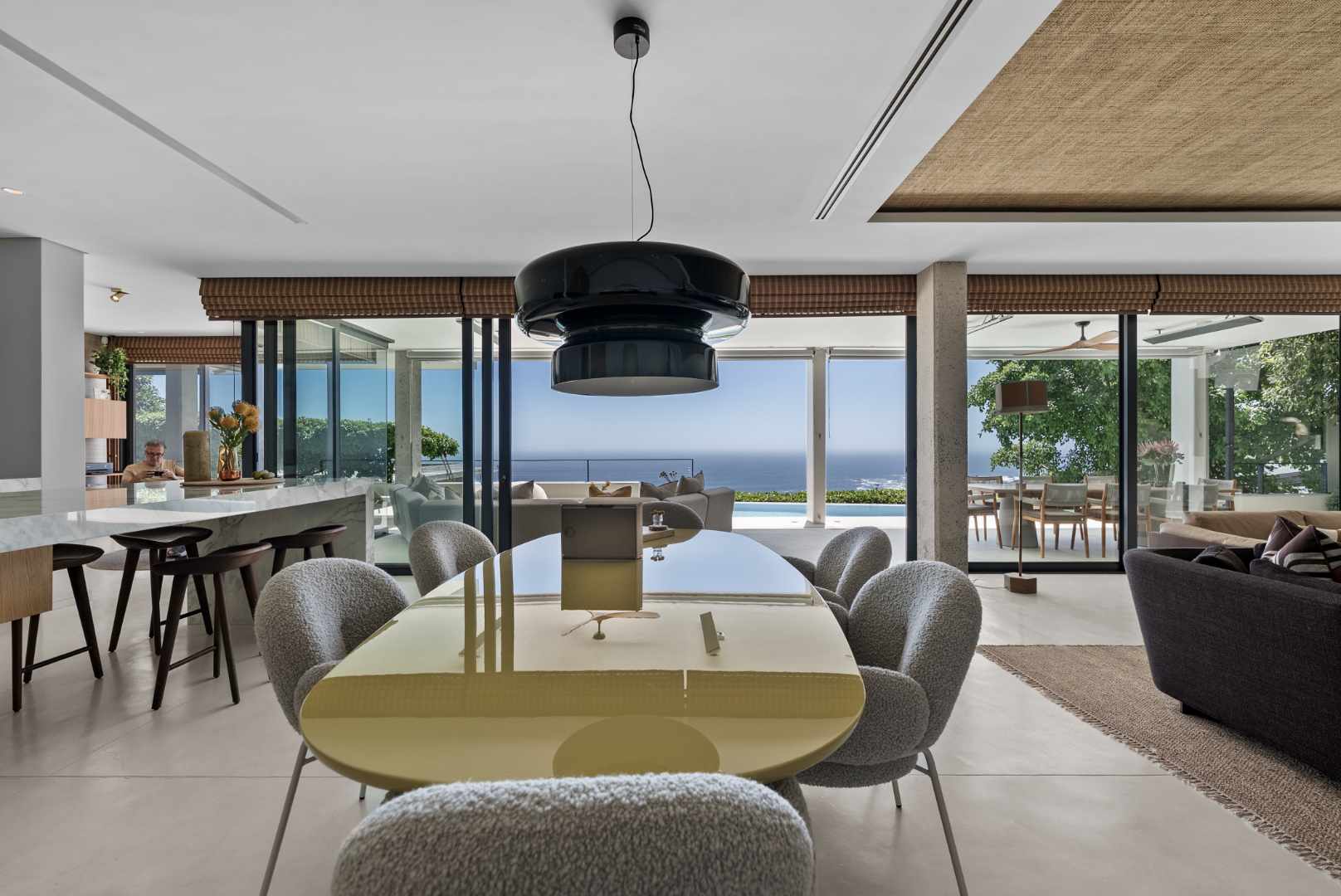 The home captures panoramic ocean and mountain views, framed by double-volume interiors and expansive glazing that draw natural light throughout the day.