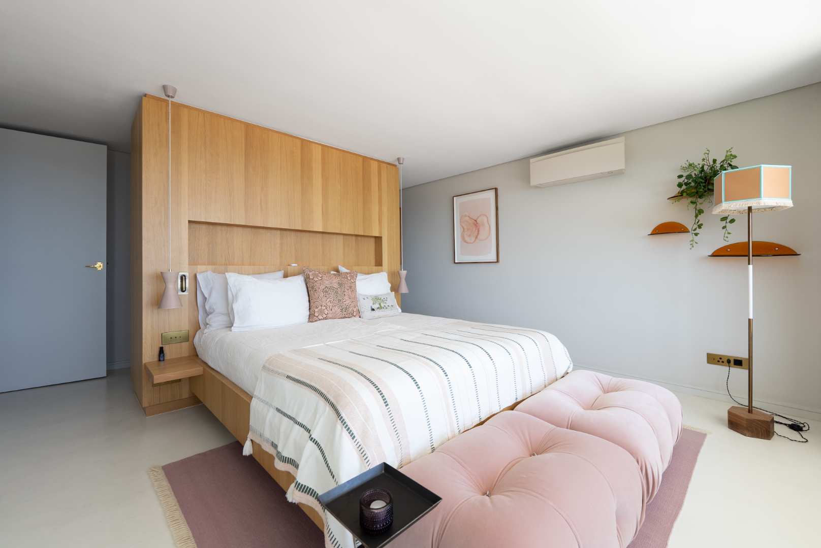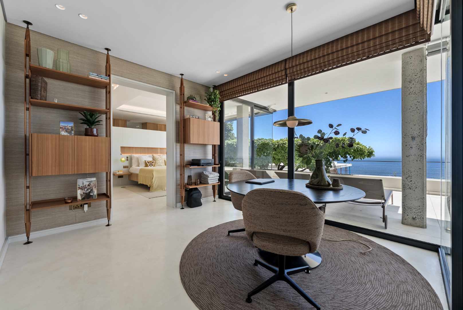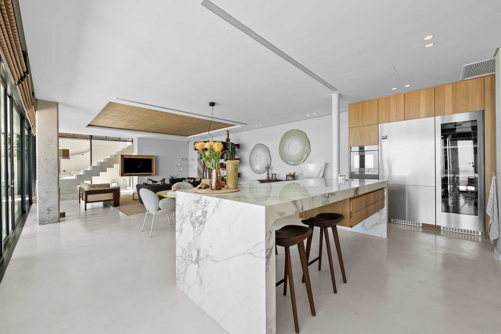 The interior is finished with microcement flooring, contributing to a seamless, modern flow that ties the architectural elements together.