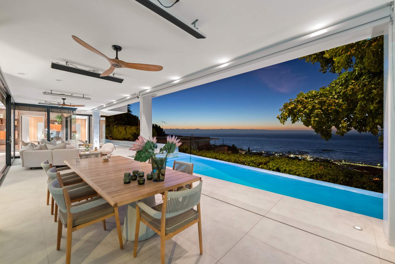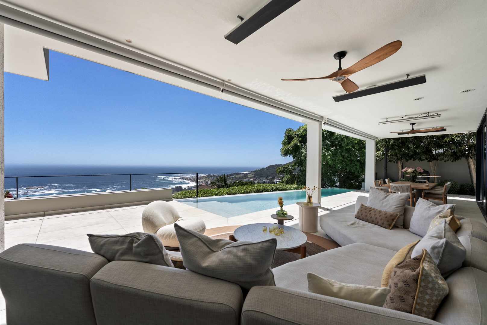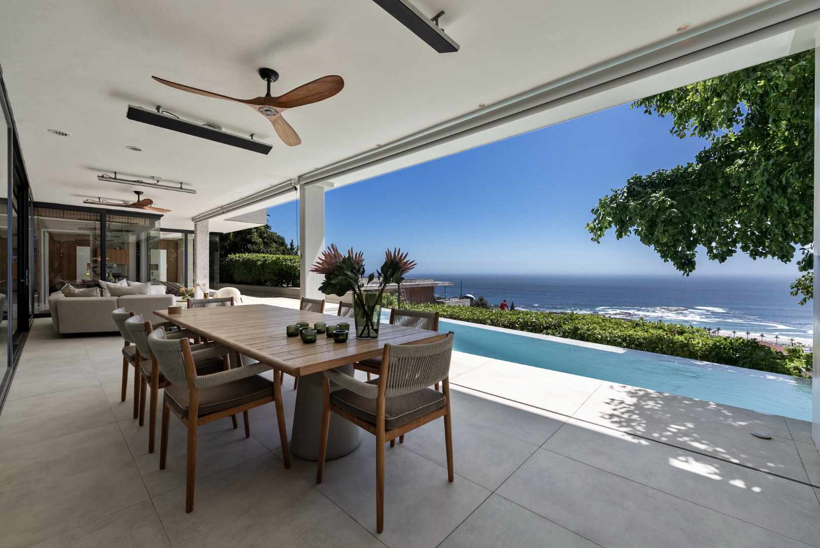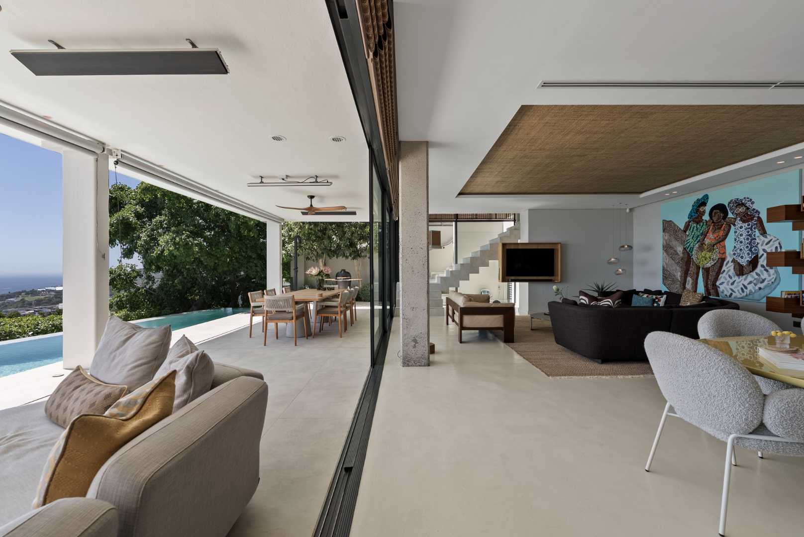 The living and dining areas open through floor-to-ceiling stacker doors onto a sheltered, wind-free terrace — an elegant extension of the home’s entertainment space. Here, a heated rim-flow pool with heat pump and automatic cover creates a serene focal point, designed for year-round enjoyment and complete privacy.