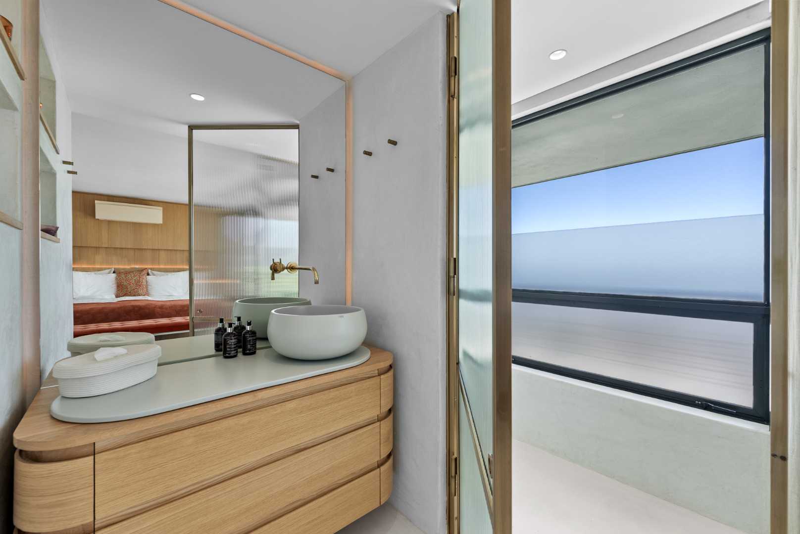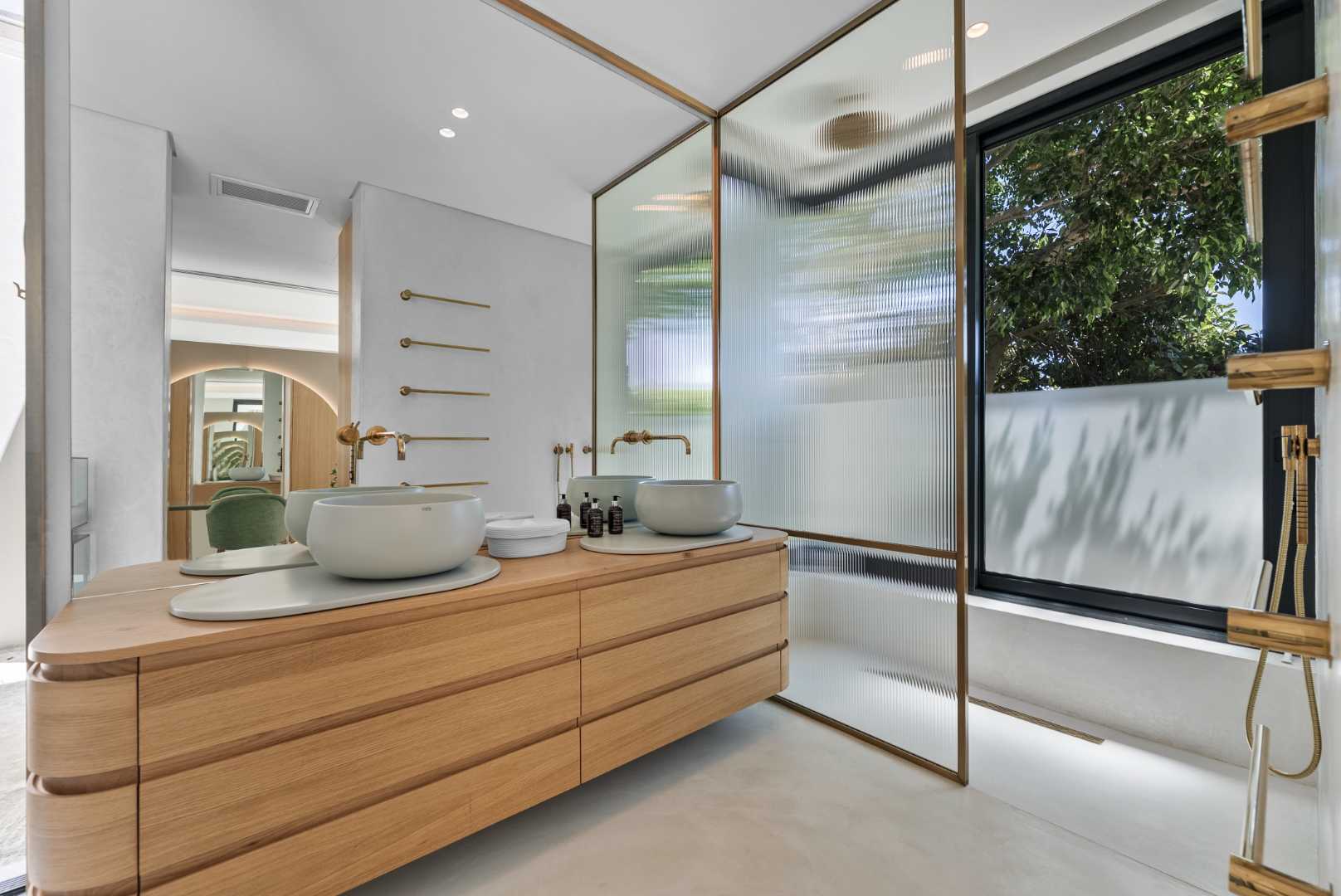 Brass Vola tapware features throughout the residence, paired with bronze shower frames, brass light fittings, reflecting a level of craftsmanship and material quality that is rarely found. Bathrooms include double showers and Ceramica Cielo finishes, all contributing to the home’s architectural integrity.
