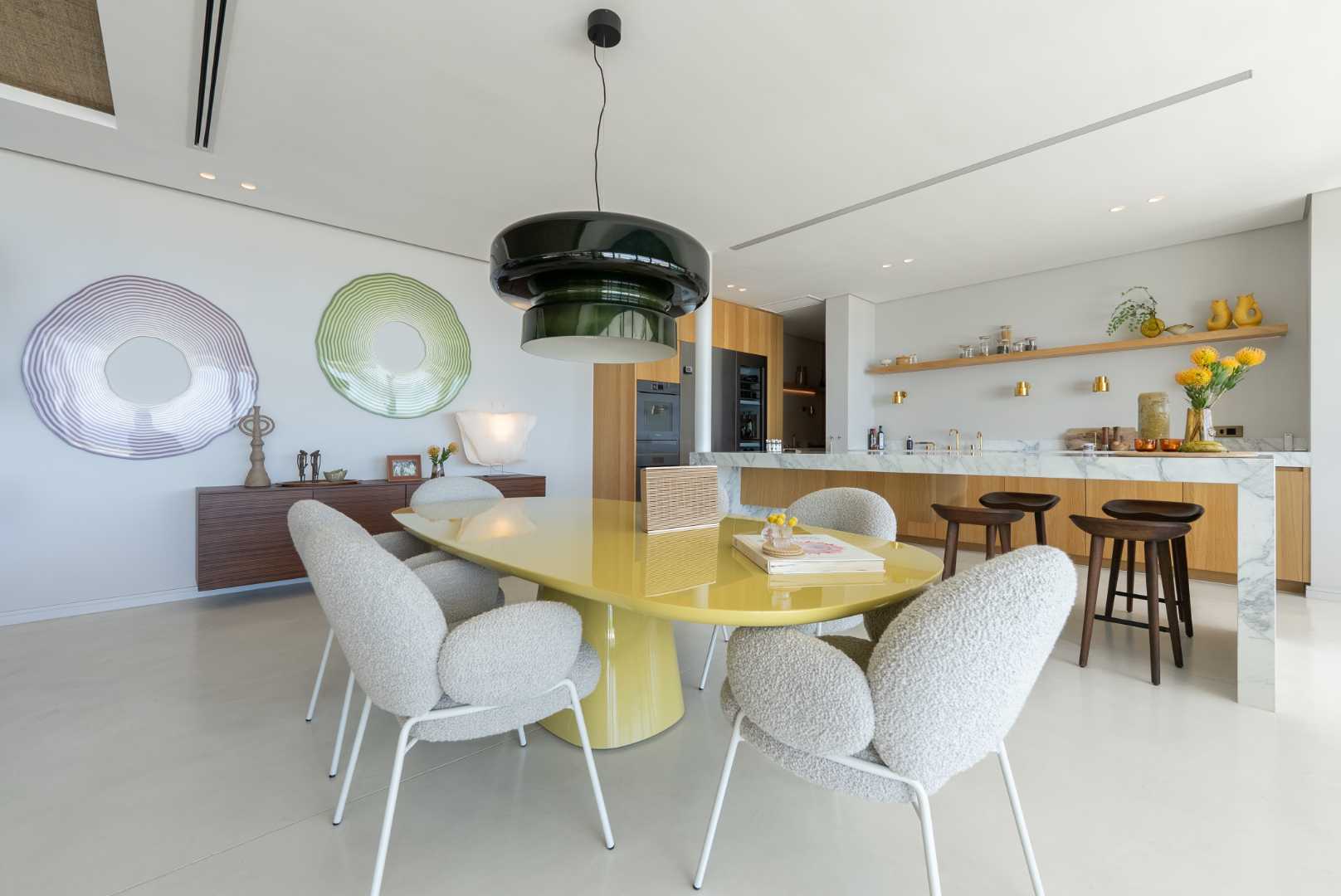 At the centre of the home, the open-plan kitchen stands out with a state-of-the-art 4-burner Invisacook hob — a seamless, modern cooking surface that sets the tone for the home’s premium finishes. The kitchen is complemented by Miele appliances, a full-spec oven and an oven-microwave, a main refrigerator and an additional cooler integrated beneath the coffee station. A spacious scullery ensures the main living areas remain uncluttered and perfectly suited to effortless entertaining. Discreet power ports beneath the island add further finesse and practicality.