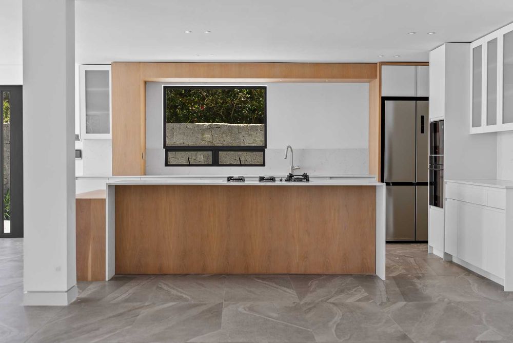 The gourmet kitchen is fitted with high-end Smeg appliances, including a washing machine, dryer, dishwasher, gas stove, microwave, and fridge, along with a spacious pantry. Elegant touches such as soft-close cabinetry, imported white marble countertops, and European-grade switches elevate the home’s stylish aesthetic.