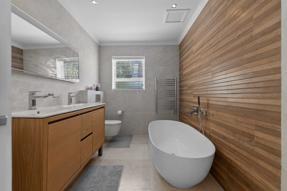 The main bedroom downstairs is notably generous in size, featuring wooden shutters and a spacious en-suite bathroom. The room opens onto a patio and pool, set within a low-maintenance garden.
