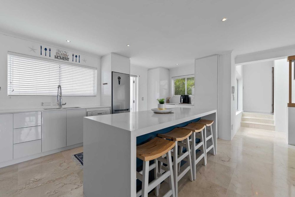 The living room is welcoming and well proportioned with ocean views, featuring a wood-burning fireplace and block-out blinds creating a cosy yet sophisticated atmosphere.